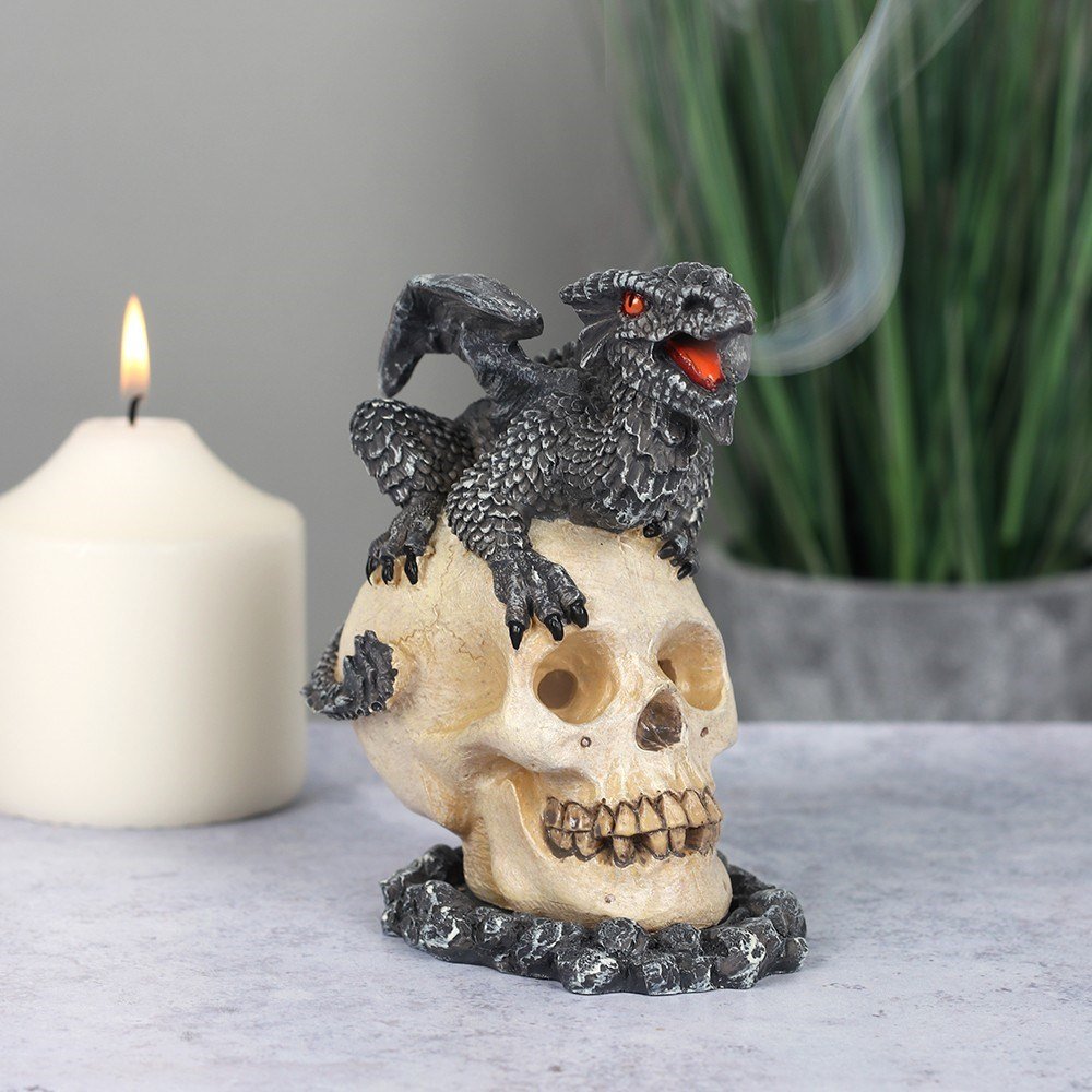 Designed by Anne Stokes, this eye catching incense cone burner features a black dragon sitting on top of a skull. When an incense cone is lit and placed inside the smoke from the cone will flow through the mouth of the dragon for an impressive feature piece.