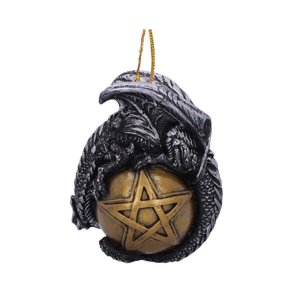 Suspended from a golden thread, this beautifully crafted Dragon coils around his treasured metallic golden sphere. Decorated with a large pentagram, this piece would make a quirky festive accompaniment or would be perfect as a year-round piece of Fantasy decor. Cast in the finest resin before being lovingly hand-painted this piece is perfect for those who have an affinity for mythical beasts.