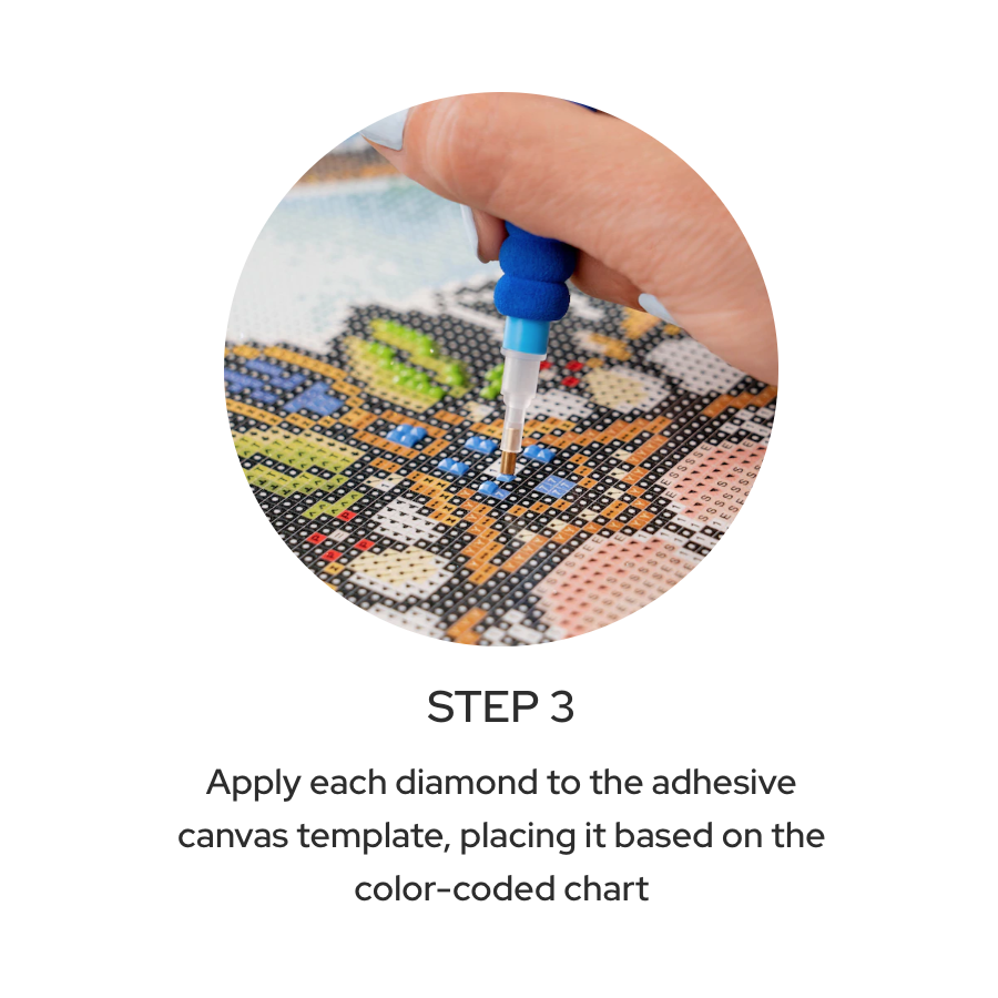 What is involved in doing Diamond Art? This meditative craft involves placing hundreds of sparkling resin rhinestones, one-by-one, on an adhesive colour-coded canvas to create a vivid, shimmering work of art.