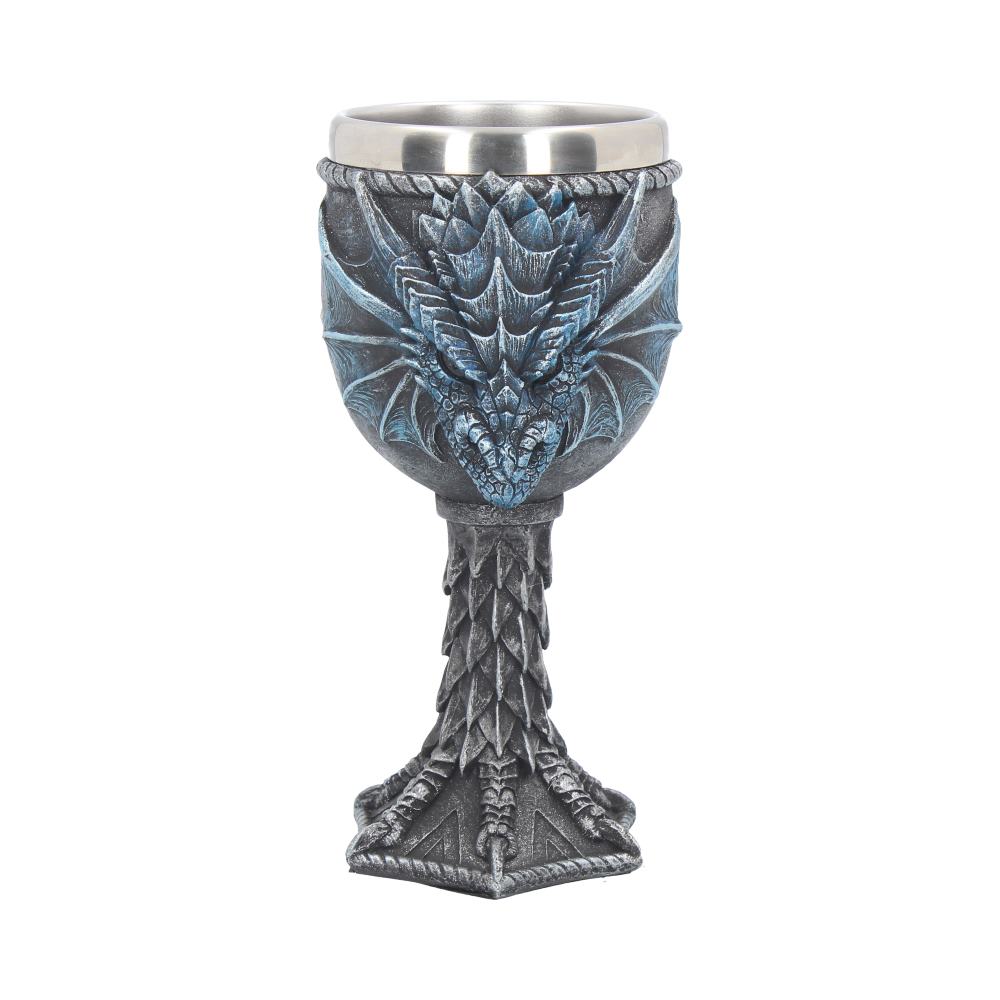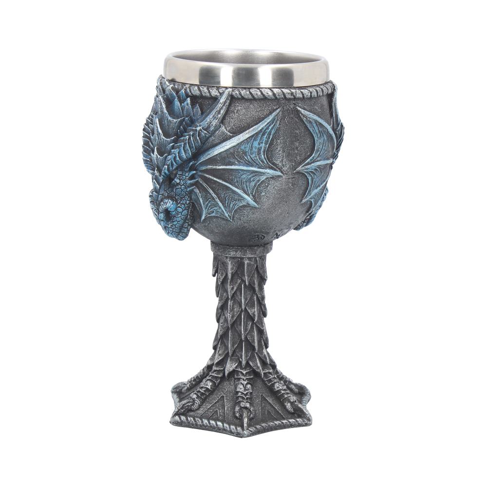 Immortalised in resin by Nemesis Now, a sapphire Dragons head adorns each side of the goblet, surrounded by a pewter-like finish. Dragon scales adorn the thick stem, transforming into reptilian claws at the hexagonal base.