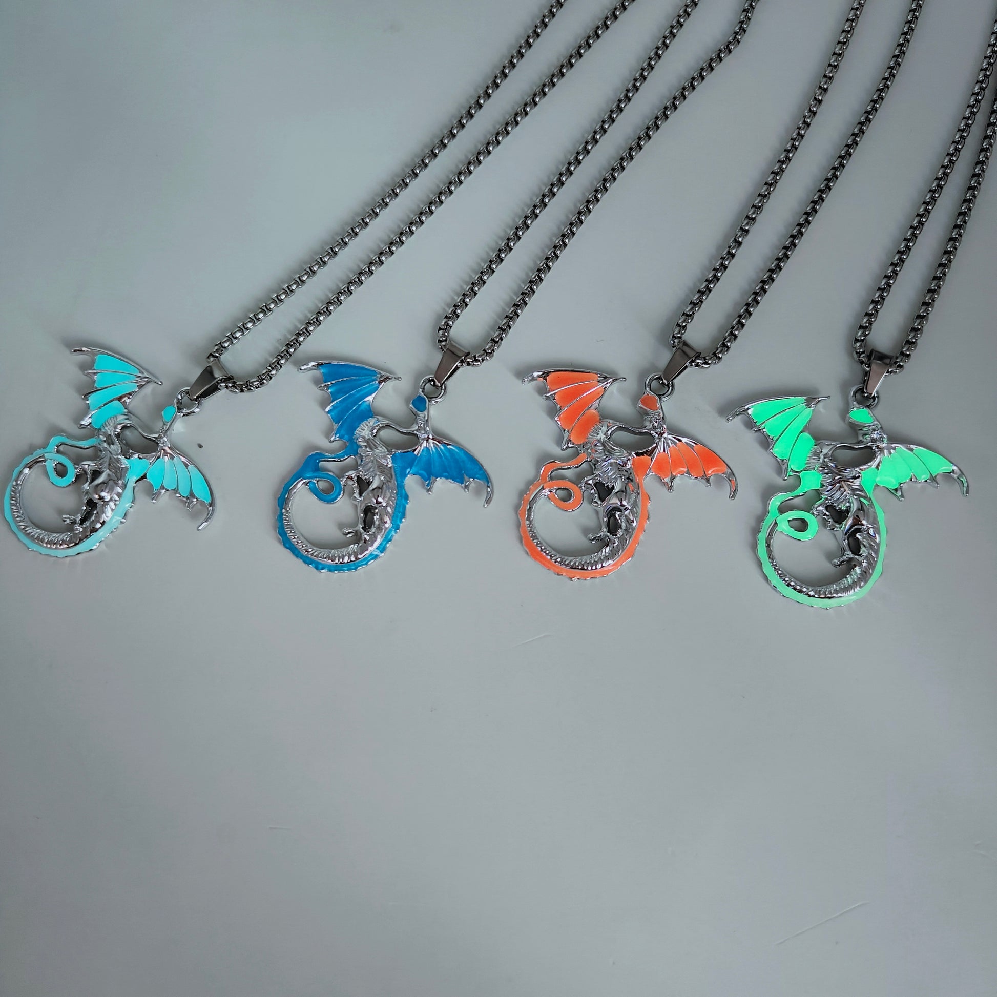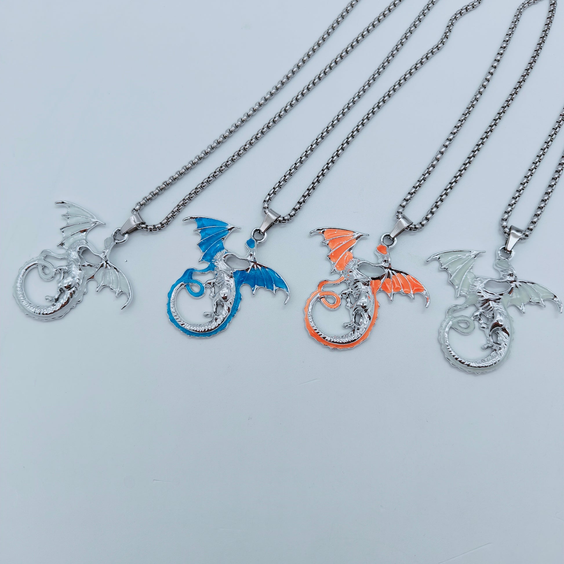 The pendant features the iconic dragon motif, inspired by the awe-inspiring dragons of the Game of Thrones universe. What sets this necklace apart is its glow-in-the-dark feature, casting a captivating aura in shades of Blue, Light Blue, Green, and Flame Orange when the lights dim.
