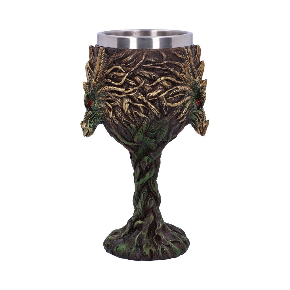The base and the stem of the goblet form a complex root system that form the goblet itself. Pictured at the centre is the head of green Dragon with gold accents on its nose and horns.