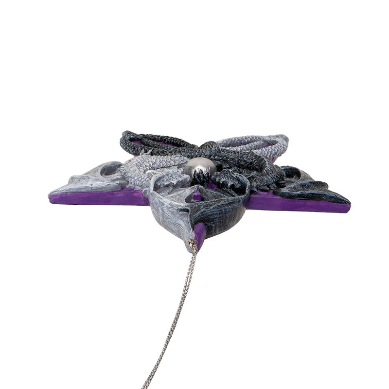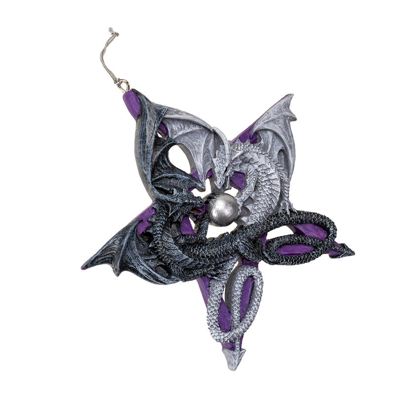 Add a touch of mystical elegance to your space with the Pentagram Dragon Ornament. This captivating piece features the renowned artwork of Anne Stokes, brought to life in striking shades of silver, black, and purple. The dragon's intricate design is complemented by the pentagram backdrop, symbolizing protection and balance.