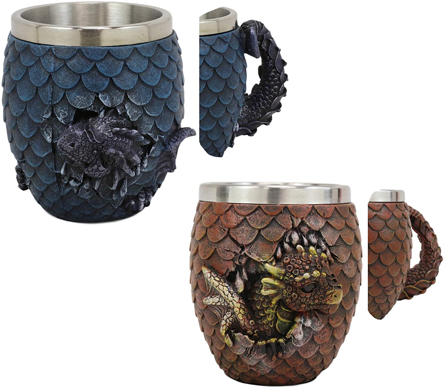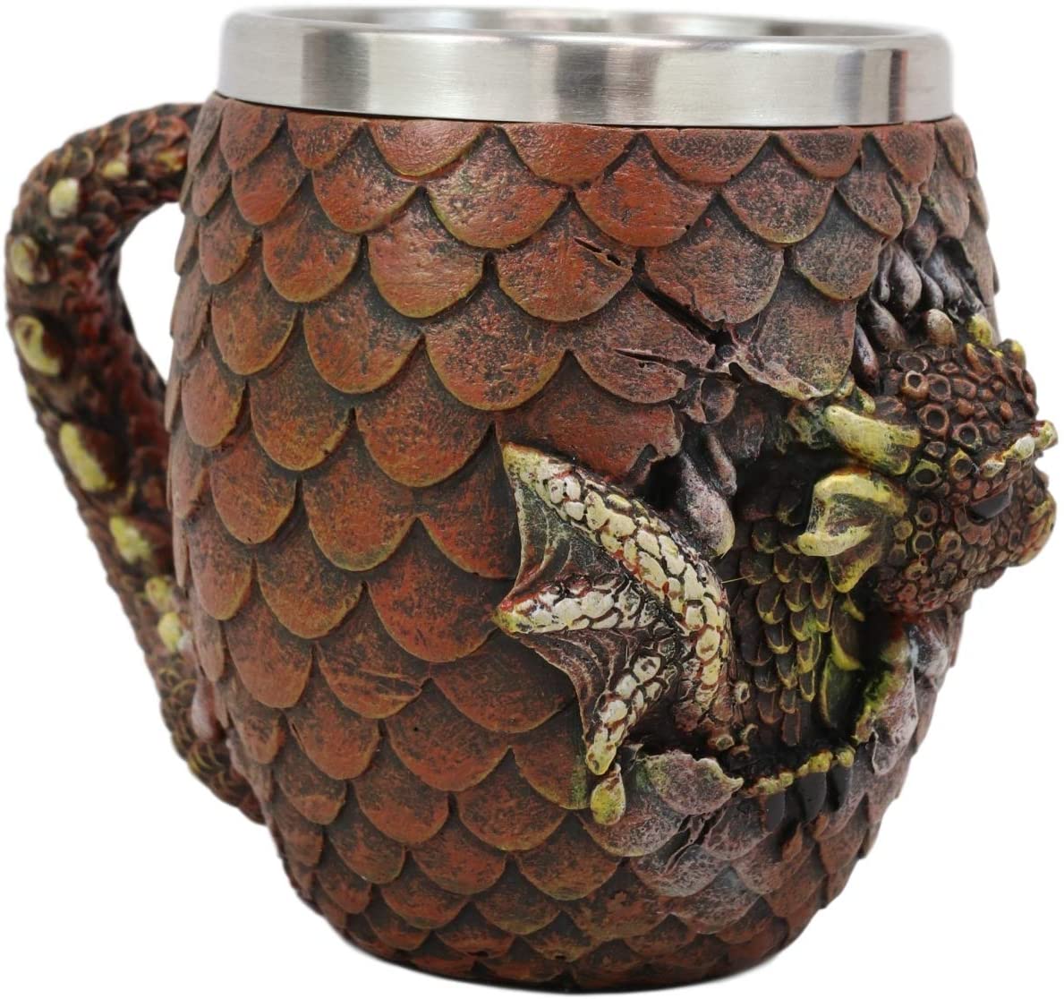 Love to enjoy a delicious beverage? Do so in style! This exquisitely designed mug is outfitted with the scales of a dragon egg, with a dragon hatchling poking its head out! The handle of the tankard is the little dragon's tail, and the whole thing is done in shades of rich reds. Inside, a stainless steel insert holds your drink. A super unique gift idea!