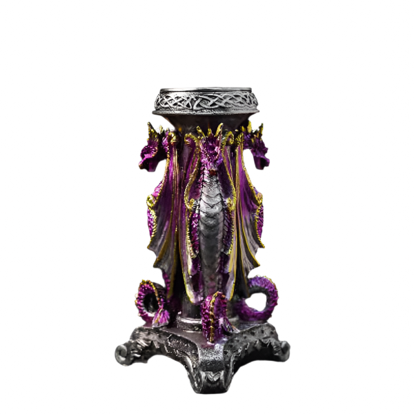 The figurine features three Purple and Silver dragons gracefully resting against a pillar, creating a harmonious and captivating scene. The dragons' intricate details, from their shimmering scales to their elegant poses, add a touch of magic to any space. The pillar elegantly supports a tea light candle (included with the holder), casting a warm and enchanting glow when lit.